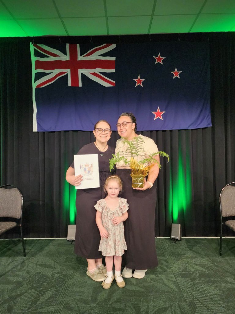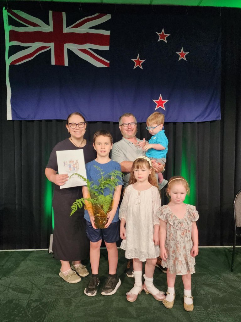 Our ceremony commenced at 10:00am, and we brought the entire family, as well as one of my dearest friends and (practically) sister, Ariana. She has been here for all of our big life events here in New Zealand, so it was beyond fitting for her to attend our citizenship ceremony. I was even more surprised to see people we know also getting their citizenship today. How cool to be able to share this experience with them! For any of you interested in knowing what the ceremony was like: it was short, sweet, and to the point. The dress was smart casual, and guests were invited to wear their native garb (we don’t have any personally, but some people from other countries were in theirs). Key community leaders were in attendance, and we were introduced to them. After a few speeches, we stood up, put up our right hand, and pledged an Oath of Allegiance to New Zealand and King Charles III. Next, they presented us with our certificate of citizenship, along with a small fern tree starter (it’s adorable!). Then Ari’s uncle Wiremu Te Awe Awe gave a welcoming speech on behalf of the Rangitane iwi (who established Palmerston North). We then watched a few congratulatory messages on the screen, and lastly, we sang New Zealand’s national anthem in both Māori and English. Afterwards, they provided some morning tea, and then I conversed with a few people. It was a really nice time!